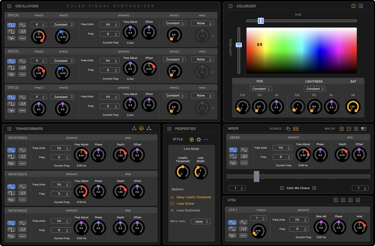 At its core, EVS borrows ideas from classic audio synthesizers. Oscillators define repeating shapes, transformers bend and distort them, and effects shape the final image over time.